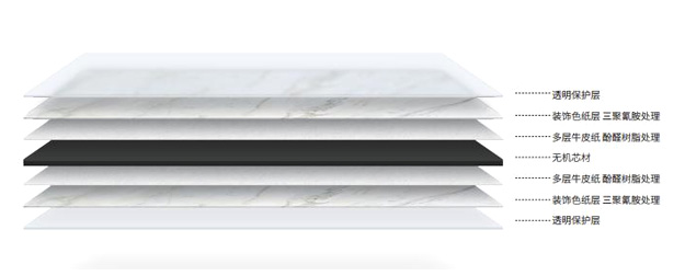 以無機不燃材料為芯材,通過高溫高壓將高強度牛皮紙、裝飾紙復合于芯材表面, 在賦予其表面裝飾性的同時具備阻止火焰傳遞的特性,且不會產生有毒氣體。抗菌抑菌